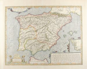 1586. MAPA : ORTELIUS, ABRAHAM : HISPANIAE VETERIS DESCRIPTIO. Ex conatibus Geographicis Abrah. Ortely. 37,5 X 49 cm. Coloreado. Gran cartela en la esquina inferior derecha con texto bajo el título HISPANIAE LOCA ALIQUOT INCOGNITAE...