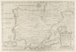 1640. MAPA : HISPANIA. 22 X 32 cm. Mapa de le península ibérica con dos cartelas decoradas, una con la leyenda ´1640 Leucoe Hispaniae´ y otro ´Hispania V Probincias Capucinorum continens...´ Colomer, 113 bis.