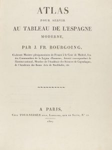 1807. - LIBRO : (ATLAS). - BOURGOING : ATLAS POUR SERVIR AU TABLEAU DE L´ESPAGNE MODERNE. Paris : Chez G. Dufour, 1807. 4º. 2 h. + 1 mapa plegado de la Península + 24 láminas de grabados con vistas y planos, varias plegadas.
