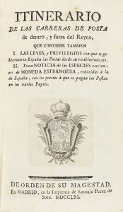 1761. - LIBRO : (ITINERARIOS-POSTAS). - ITINERARIO DE LAS CARRERAS DE POSTA DE DENTRO Y FUERA DEL REYNO QUE CONTIENE TAMBIEN LAS LEYES Y PRIVILEGIOS (...) Y UNA NOTICIA DE LAS ESPECIES CORRIENTES DE MONEDA ESTRANGERA... Madrid : Imp. de Antonio...
