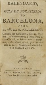 1797. - LIBRO : (BARCELONA). - KALENDRIO Y GUIA DE FORASTEROS EN BARCELONA PARA EL AÑO... Barcelona : en la Imprenta del Diario, 1797. 12º. 418 p. + 5 h. Texto fileteado. Enc. en tela arpillera reciente, tejuelo.