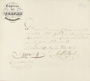1842. COLECCIONISMO : (RECIBO). - RECIBO TEATRO DE BARCELONA. 19 x 21 cm. Recibo de la empresa del Teatro de Barcelona en el año 1842.