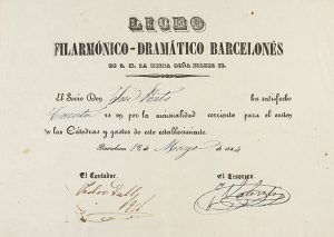 1844. COLECCIONISMO : (RECIBO). - RECIBO LICEO. 15 x 22 cm. Recibo para Liceo Filarmónico-Dramático Barcelonés de S.M. la Reina Doña Isabel II el año 1844.