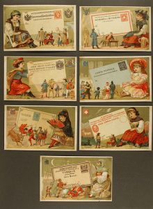1900 ca. - COLECCIONISMO : 7 CROMOS CROMOLITOGRAFICOS CON TARJETAS POSTALES DE DIFERENTES PAISES Y SUS TIPOS NACIONALES. ▬ [Más : ] • 15 CROMOS CROMOLITOGRÁFICOS CON ESCENAS INFANTILES.