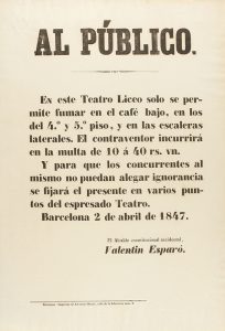 1847. CARTEL : (COLECCIONISMO-TEATRO). - CARTEL LICEO. 32 x 23 cm. Cartel dirigido al público del Teatro Liceo donde se comenta que está prohibido fumar el 1847.