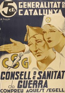1937 ca. CARTEL : (GUERRA CIVIL-FILATELIA). - VICENTE, E. : 5 CTS. GENERALITAT DE CATALUNYA. CONSELL DE SANITAT DE GUERRA. COMPREU AQUEST SEGELL. Cartel litográfico, 49 x 34 cm.