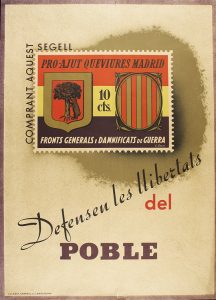 1938 ca. CARTEL : (GUERRA CIVIL-FILATELIA). - COMPRANT AQUEST SEGELL DEFENSEU LES LLIBERTATS DEL POBLE. Barcelona : Seix i Barral, s.a. 50 x 36 cm.
