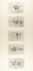 1904-1906. POSTALES : (DIBUJO). - CUSACHS : 5 POSTALES ORIGINALES DE CUSACHS. 1904-1906. 9 cm x 14 cm. 5 postales originales de Cusachs dibujadas con acuarela sobre temática militar. Firmadas y fechadas.