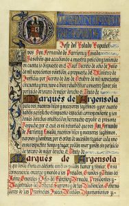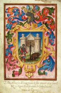 1550 ca. - ORIGINAL ARTÍSTICO : (PAIS VASCO-CAZA). - ESCUDO DE ARMAS DEL LINAJE DE LOS GORROZPEZ Y SEGURA,. originarios del término de Cegama, en Guipúzcoa. Tinta y aguada sobre pergamino, 25 x 17 cm. Detallada escena de caza del jabalí en...