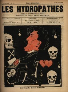 Journal littéraire illustré. – Les Hydropathes. – Tout-Paris. Paris, 1879-1880. 33 livraisons (sur 37) en un volume in-4, bradel percaline grise, pièce de titre en chevrette rouge sur le plat supérieur (Reliure de l'époque). Collection quasi complète des deux années de parution de cette célèbre revue animée par Émile Goudeau. Les trente-sept livraisons de la revue, publiée du 22 janvier 1879 au 26 juin 1880, se composent de 4 ou 8 pp. et sont illustrées sur la page de titre d'un grand portrait satirique en deux tons, exécuté le plus souvent par Georges Lorin dit Cabriol, représentant un membre du club des Hydropathes ou un sympathisant, tels Émile Goudeau, André Gill, Félicien Champsaur, Charles Cros, Sarah Bernhardt, Auguste Vacquerie, etc. Le no 1 de la seconde année comprend de plus une composition à double page d'Eugène Le Mouël intitulée Une séance aux Hydropathes. Le présent ensemble réunit vingt-trois des vingt-quatre livraisons de la première année (le no 18 manque) ; six des huit livraisons de la seconde année (les nos 5 et 6 manquent) ; et quatre des cinq livraisons de la nouvelle série parue à partir du 23 mai 1880 sous le titre Tout-Paris (le no 13 manque). Les deux numéros spéciaux de 1899 et 1919 ne sont pas joints. Coiffes et pièce de titre frottées, bande terne à la première page et menues déchirures. Bel exemplaire toutefois, compte tenu de la fragilité du papier.