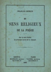 MORICE (Charles). Du sens religieux de la Poésie : sur le mot Poésie. Le principe social de la Beauté. Genève, Eggimann ; Paris, Vanier, 1893. In-8, bradel demi-maroquin bleu, couverture (Honegger). Édition originale, dont il ne semble pas y avoir eu de grand papier. Il s'agit du texte de deux conférences données par Charles Morice à Genève en 1897. Il cite un court texte que Mallarmé avait rédigé pour lui à cette occasion : Opinion de Poe (p. 18). On joint deux préfaces de Mallarmé : – CAZALS (Frédéric-Auguste). Iconographies de certains poètes présents. Album n°1 : Laurent Tailhade. Paris, Bibliothèque de La Plume, 1894. Petit in-4, broché, chemise à dos de maroquin brun et étui (Honegger). Édition originale et premier tirage des illustrations, comprenant un portrait-frontispice et douze portraits de Laurent Tailhade gravés sur bois d'après Cazals. Tirage à 145 exemplaires, celui-ci un des 100 sur chine. – [Préface pour Le Sang des Crépuscules de Charles Guérin]. [Paris, Mercure de France, 1895]. Bifeuillet in-8 de papier japon impérial, veau beige, chemise et étui (Honegger). La préface est ici dissociée de l'ouvrage qu'elle devait accompagner. Imprimée séparément, elle n'a probablement pas été jointe. Mallarmé n'y accordait guère d'importance et, dans une lettre à Charles Guérin, il déclara « Je trouve cette petite page un peu pédante ; attachez-la donc par un fil, un sinet comme vous dites de soie éclatante et douce à l'égal de vos vers » (Correspondance, 1862-1871, Henri Mondor, Gallimard, 1959). Dans les exemplaires qui la possèdent la préface est raccordée par une fine cordelette.