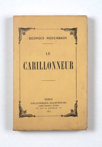 Le Carillonneur. Paris, Eugène Fasquelle, 1897. In-12, broché, non coupé. Édition originale. Publié trois ans après Bruges-la-Morte, Le Carillonneur est le dernier roman de Rodenbach. C'est aussi « son chef-d'œuvre – d'après son biographe Pierre Maes – où Bruges, une fois de plus, est partout présente. C'est son plus grand effort en prose, celui de ses livres qui mérite le plus de durer ». Un des 3 exemplaires de tête sur japon, celui-ci le n°1. Ce rarissime tirage sur japon est demeuré inconnu à A. Grisay, qui ne mentionne que les 15 exemplaires sur hollande ; il est toutefois cité dans la bibliographie de l'ouvrage de Pierre Maes. Exemplaire irréprochable, à l'état de neuf. Pierre Maes, Georges Rodenbach, Gembloux, 1952, p. 268 ; bibliographie, p. 307 – Antoine Grisay, « Bibliographie des éditions originales de Georges Rodenbach », Le Livre et l'Estampe, n°44, III/1965, pp. 309-313.