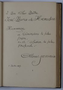 Au jardin de l'Infante. Augmenté de plusieurs poèmes. Paris, Mercure de France, 1897. In-12, maroquin bleu nuit janséniste, filets sur les coupes, jeux de filets entrelacés intérieurs, doublures et gardes de soie brochée bleue et blanche, couverture et dos, tranches dorées sur témoins (Chambolle-Duru). Seconde édition, en partie originale. Un des 12 exemplaires sur hollande, seul tirage en grand papier après 3 japons. Très bel envoi autographe signé de l'auteur à José-Maria de Heredia : à mon Cher Maître José-Maria de Heredia, hommage de l'admiration la plus pure, et de l'affection la plus profonde d'Albert Samain, 8 juillet 1897. L'influence du maître des Parnassiens était sensible dans les premiers vers de Samain et, bien qu'il s'en dégagea ensuite, certains critiques verront toujours l'ombre du Parnasse planer sur son œuvre. Somptueux exemplaire remarquablement établi à l'époque par Chambolle-Duru. Le volume est enrichi d'une lettre autographe signée de l'auteur à François Coppée, datée du 30 avril 1898, relative au poème Luxure, imprimé ici-même (p. 179). Coppée avait lancé Samain dans le milieu littéraire deux ans plus tôt. On a joint, de plus, une plaisante liste autographe dans laquelle Samain énumère les noms de ses amis – Jammes, Coppée, Heredia, Louÿs, Verhaeren, etc. – et les formules de dédicace qu'il leur destine.