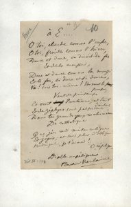 À E.... Poème autographe signé, s.d. [Paris, vers 1893]. Une page in-8. Poème autographe signé de Paul Verlaine de seize vers, formant quatre strophes, et comportant deux ratures. Le poème deviendra la pièce XLVII de la seconde édition de Dédicaces (1894). On lit en haut à gauche, d'une autre main : « Varia », et en bas : « Vol. III-132 », désignant le volume et la page des Œuvres complètes (1899) où il a été réimprimé. Verlaine a voulu que la dédicace ne comporte qu'une initiale pour désigner l'inspiratrice de son poème. Bien que dans l'édition originale ce « E » soit suivi de trois points de suspension, il est ici accompagné de cinq points. Ceux-ci pourraient signaler les cinq lettres manquantes d'Esther (pour Philomène Boudin). Le « Diable angélique » évoqué par le poète peut cependant également rappeler l'autre compagne de Verlaine, Eugénie Krantz, au caractère plus acariâtre. Jacques Borel, dans l'édition de la Pléiade, ne donne aucune d'indication.