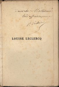 Louise Leclercq. Paris, Léon Vanier, 1886. In-12, broché, emboîtage en demi-maroquin havane à bandes (Devauchelle). Édition originale. Un des 1100 exemplaires sur vélin du tirage courant. Précieux exemplaire offert par Verlaine à Mallarmé avec cet envoi autographe signé sur le faux-titre : à mon cher Mallarmé, très affectueusement, P. Verlaine. Des bibliothèques André Lefèvre (1968, n°825) et du baron Louis de Sadeleer, avec ex-libris. Dos frotté, quelques légères rousseurs, coupure marginale p. 3.