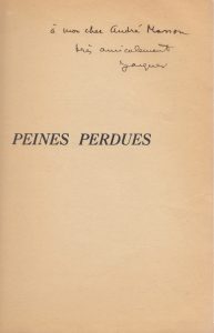 Peines perdues. Paris, R.-A. Corrêa, 1933. In-8, broché. Édition originale. Envoi autographe signé à André Masson. On joint deux ouvrages, du même : Paroles (1923-1927). Marseille, Les Cahiers du Sud, 1929. In-8, broché. Édition originale, ornée d'un frontispice de Max Ernst. Un des 400 exemplaires numérotés sur alfa. Envoi autographe signé à Zborovsky. – L'An I du Surréalisme, suivi de L'An dernier. Paris, Denoël, 1969. In-8, broché, jaquette illustrée. Édition originale. Envoi autographe signé.