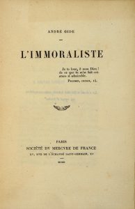 L'Immoraliste. Paris, Société du Mercure de France, 1902. In-16, broché, couverture bleue. Édition originale de l’une des œuvres les plus significatives de Gide, qui « consacra son originalité et sa maîtrise aux yeux du public lettré » (En français dans le texte, n°330). Tirage unique à 300 exemplaires sur vergé d’Arches. Édition typographiquement imitée de la deuxième édition du Faust de Goethe traduit par Nerval, dite « édition bleue », parue en 1835. Envoi autographe signé, dont le nom du destinataire a été découpé. Couverture insolée avec petites déchirures sans manque. Talvart & Place, VII, 42, n°16-A.