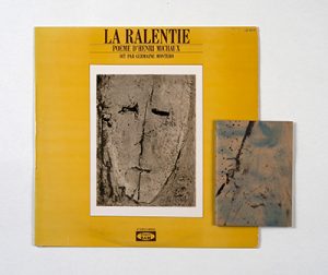 La Ralentie. Paris, GLM, 1937. In-16, agrafé, monté sur un onglet dans une reliure de maroquin teinté souple, doublures de papier japon bleu, gardes de daim ocre, doubles gardes de papier japon bleu, conservé avec un disque 33 tours dans un emboîtage de toile grise (A. Baudry). Édition originale. Elle a été tirée sur papier couché de couleurs, ici bleu et jonquille. Intéressant ensemble autour de ce texte comprenant également un disque vinyle 33 tours : La Ralentie, poème d'Henri Michaux dit par Germaine Montero, et une clé USB contenant le poème dit par Germaine Montero.