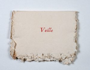 Veille. Paris, Gwenn-Aël Bolloré, Librairie universelle, 1951. Petit in-4 oblong en feuilles, non rogné, chemise et étui. Édition originale. Tirage unique à 65 exemplaires sur papier pur chiffon des moulins de l'Odet. Séduisant livre-objet édité par Gwenn-Aël Bolloré. Défauts à l'étui-chemise.
