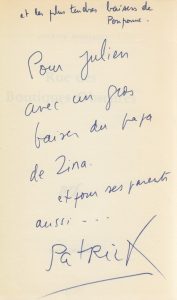 Ensemble de neuf ouvrages dédicacés à Jérôme, Judith ou Julien d'Astier de la Vigerie. Rue des Boutiques obscures. Paris, Gallimard, 1978. – Dimanches d'août. Paris, Gallimard, 1986. – Vestiaire de l'enfance. Paris, Gallimard, 1989. – Remise de peine. Paris, Le Seuil, 1989. – Voyage de noces. Paris, Gallimard, 1990. – Un cirque passe. Paris, Gallimard, 1992. – Chien de Printemps. Paris, Le Seuil, 1993. – La Petite Bijou. Paris, Gallimard, 2001. – 28 Paradis. Paris, L'Olivier, 2005. Ouvrage co-écrit et illustré par Dominique Zehrfuss. Soit 9 volumes in-8 et in-12, brochés, tous en édition originale excepté Remise de peine. Exemplaires de lecture un peu jaunis.