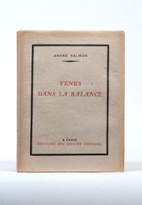 Vénus dans la balance. Paris, Éditions des Quatre Chemins, [1926]. In-8, en feuilles, couverture imprimée, non rogné, chemise et étui modernes. Édition originale. Elle est ornée d'une eau-forte de Julius Pascin sur japon signée par l'artiste. Tirage à 325 exemplaires, celui-ci un des 25 sur japon impérial signés par l'auteur, comportant un quatrain manuscrit, probablement autographe, sur une garde.