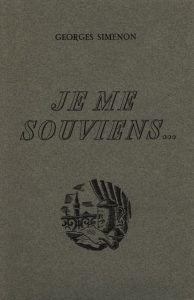 Je me souviens… Illustré par Jean Reschofsky. Paris, Presse de la Cité, 1945 ; grand in-8 en feuilles, couverture illustrée rempliée, chemise et étui. Édition originale, tirée à 1100 exemplaires sur papier vergé Ingres de Lana. Nombreux dessins dans le texte de Jean Reschofsky. Envoi autographe en tête : « À mon cher vieux Raymond Ziza cette histoire dont il connaît si bien la suite. En souvenir d’un trop court chapitre qu’il vient de vivre à Madow Rock Farm et du 13 octobre (vendredi !) 1950. Fraternellement Georges Simenon, Lakeville, Conn. ».