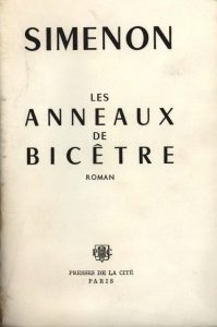 Les Anneaux de Bicêtre. Roman. Paris, Presse-de-la-Cité, 1963 ; in-8 broché, traces d’humidité au dos (muet). Édition originale. – Exemplaire de premier mille. Envoi autographe en tête : « À mon vieux Ziza témoin et ami de toujours. Affectueusement Georges Simenon 1963 ». Petite décharge de rouleau adhésif au premier et au dernier feuillet.