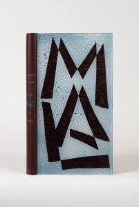 Que mal y soit. Pierre Bettencourt, 1961. In-8, reliure à plats rapportés, plats de plexiglas peint et imprimé, dos de bos chocolat titré, doublure et gardes de papier imprimé, couverture et dos conservé, étui (Daniel Mercher). Édition originale limitée à 300 exemplaires numérotés sur vélin Lana. Rare bande d'annonce conservée : Quelqu'un qui a eu l'expérience de l'exaspération. Henri Michaux.