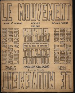Le Mouvement perpétuel Paris, Gallimard, 1926. In-4 broché, couverture illustrée par Max Morise. Édition originale limitée à 366 exemplaires. Un des 170 exemplaires numérotés sur vergé d’Arches illustrés de deux dessins reproduits de Max Morise. Citation autographe d’Alfred Jarry sur le second plat de la main de Louis Aragon : « Le bain n’est pas un exercice. Alfred Jarry ».