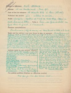 Manuscrit et carte autographes signés. [1943]. - Manuscrit autographe à l'encre verte, réponse au questionnaire imprimé de Francis Dumont. 2 pages in-4. - Une carte autographe de Noël Arnaud à l'encre verte signée relative à Xavier Fornet. On joint : Le bulletin de souscription du Surréalisme encore et toujours. Publication de la Main à plume, adressée à Francis Dumont.