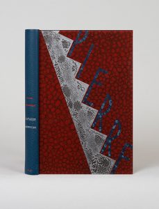 Abatages clandestins. Plutarque, André Gide, H. Michaux, G. Ohnet, P. Valéry, J. Cocteau. Pierre Bettencourt, 1943. Petit in-8, reliure à plats rapportés, plats de plexiglas peint, décor sur le premier plat formant le prénom de Bettencourt, dos de box bleu canard, dos titré au paladium, couverture et dos conservés, doublures et gardes de papier imprimé, étui (Daniel Mercher). Édition originale limitée à 300 exemplaires sur Arches.