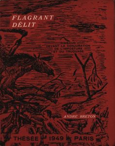 Flagrant délit. Paris, Thésée, 1949. In-8, couverture illustrée, broché. Édition originale dénonçant la Chasse spirtiuelle faussement attribué à Arthur Rimbaud. Un des 100 premiers exemplaires numérotés sur hollande et signés par André Breton.