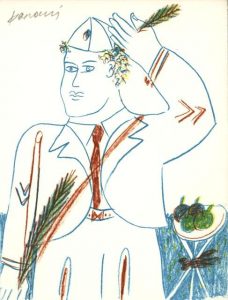 Soldat d'amour. Paris, Édition Théorème, 1988. In-12, en feuilles, couverture illustrée, chemise toilée à ruban de l'édition. Édition originale limitée à 99 exemplaires numérotés et signés par l'auteur, illustrée de 5 lithographies toutes signées par Fassianos.