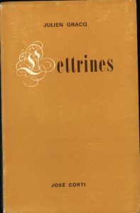 Lettrines. Paris, José Corti, 1967. In-12, broché. Édition originale. Un des 200 exemplaires numérotés sur alfa mousse. On joint : GRACQ (Julien). Lettrines 2. Paris, José Corti, 1974. In-12, broché. Édition originale. Un des 150 exemplaires numérotés sur vergé ivoire.