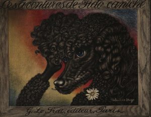 Les Aventures de Fido Caniche. Paris, Guy Le Prat. In-4 oblong, couverture illustrée par Valentine Hugo. Édition originale du texte et des illustrations de Valentine Hugo. Remarquable réalisation reproduisant le texte autographe en blanc et les dessins en blanc sur fond noir de Valentine Hugo.