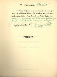 Poésies. Paris, Le Terrain vague, 1960. In-8, broché. Première édition commentée par Georges Goldfayn et Gérard Legrand. Exemplaire de Maurice Blanchot portant cet envoi autographe signé et rédigé conjointement par les deux auteurs : « à Maurice Blanchot... il n'y a qu'un point indivisible qui soit le véritable lieu : les autres sont trop près, trop loin, trop haut ou trop bas. La perspective l'assigne dans l'art de la peinture, mais dans la vérité et dans la morale qui l'assignera ? »