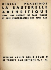La Sauterrelle arthritique. Paris, GLM, 1935. In-8, broché. Édition originale limitée à 125 exemplaires et quelques hors-commerce, dont celui-ci. Préface de Paul Éluard et photographie par Man Ray représentant le groupe surréaliste et Gisèle Prassinos. Envoi autographe signé : « À Monsieur Harlong, il est bon d'appuyer sur ses ongles à l'approche de la Saint Médard ».