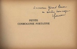 Petite cosmogonie portative. Paris, Gallimard, 1950. In-16 oblong, demi-toile brune, dos titré, plat de papier imprimé, couverture conservée (Gauché). Édition originale. Exemplaire du service de presse. Envoi autographe signé de Raymond Queneau à Gérard Bauër.