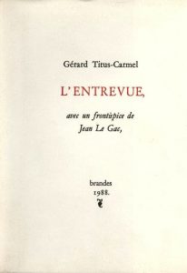 L'entrevue. Béthune, Brandes, 1988. In-12, en feuilles. Édition originale. Un des 45 premiers exemplaires numérotés sur vélin d'Arches, signés par Titus-Carmel et Jean Le Gac, comportant un tirage original de la photographie de Jean Le Gac.
