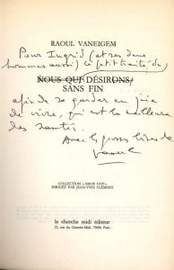Nous qui désirons sans fin. Paris, Le Cherche midi, 1996. In-8, broché. Édition originale. Envoi autographe signé : « Pour Ingrid (et ses deux hommes aussi) ce petit traité du DÉSIR SANS FIN afin de se garder une joie de vivre qui est la meilleure de santé avec les grosses bises de Raoul ».