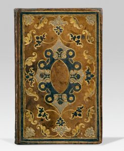 des rinceaux ponctués de fers azurés ou peints en noir, dos lisse richement orné, tranches dorées (Reliure de l’époque).