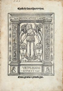 ♦ Belle édition lyonnaise des lettres de saint Jérôme, imprimée en caractères romains par Nicolas de Benedictis pour Jacques Sacon.