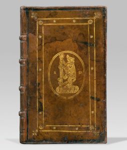 des plats, bordure dessinée par deux filets dorés, petit fer aux angles, emblème doré au centre, dos orné, tranches dorées et partiellement ciselées (Reliure de l’époque).