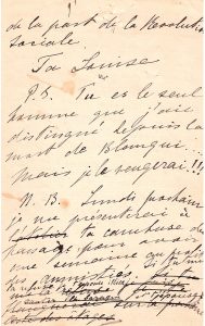 Quant au mot chevalier, (…) il excite tous mes mépris (…). Elle lui envoie cependant ses embrassements les plus anarchiques de la part de la Révolution sociale, signant « ta Louise », évoquant Louise Michel puis mentionnant la mort de Blanqui.