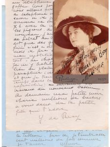 On trouvera encore à travers cette correspondance les liens très étroits d’Yvonne avec de nombreux artistes et personnalités de l’époque dont Volterra, Rochegrosse, Mittenhoff, Dunoyer de Segonzac, Léonce de Joncières, Olympe Herriot, Armand Silvestre (dont elle est la nièce), Colette, Régnier, Guitry, Abel Hermant, Pierre Wolf, quelques personnalités américaines, mentionnant encore l’intervention de la présidence de la République, etc.