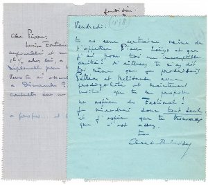 • une lettre pleine d’humour de Pierre LOUŸS demandant des nouvelles de son ami Claude Debussy (octobre 1899, 1 pp. sur pneumatique, adresse au verso). Je viens d’apprendre par le Dictionnaire de Musique de Riemann les renseignements biographiques les plus complets sur mon ami Debussy. Sais-tu ce qu’il est devenu ? j’en entends encore parler par une dame qui voyage à l’étranger et qui, m’écrit-elle, chante dans les ruines les plus romaines :