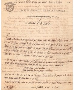 Alexandre-Balthazar-Laurent GRIMOT de LA REYNIERE. 1758-1837. Le fameux gastronome, auteur de l’Almanach des Gourmands. L.A.S. à M. de Haller. Au Château de Villers-sur-Orge, 2 juin 1814. 2 pp. sur bi-feuillet in-4, en-tête à son nom et...