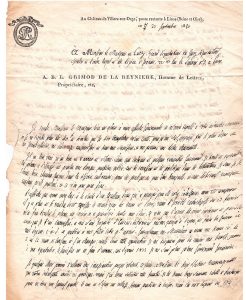 ► Belle lettre relative à son projet d’une nouvelle publication culinaire. Je rends (…) bien des grâces à mon affiche gourmande de m’avoir rappelé à votre aimable souvenir (…).