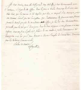 La Fayette précise qu’il lui doit une reconnaissance personnelle pour le zèle qu’il témoigna dans des tems orageux à ma femme et à mes enfans (…).