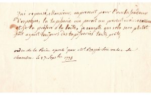Une note postérieure indique que cet ordre de la Reine a été apporté par M. Bazin, son valet de chambre.